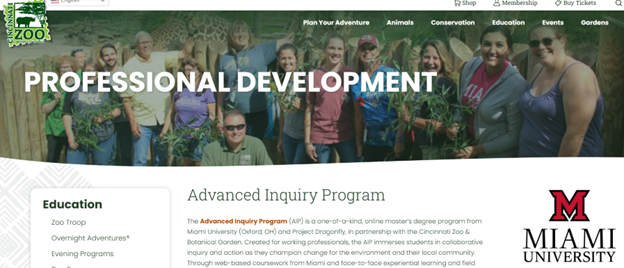 As the Graduate Program Manager at the Cincinnati Zoo & Botanical Garden I am a human-shaped bridge between the Zoo and Miami University. Miami University in Oxford, OH is the accredited institution through which our students earn their M.A. in Biology. The Advanced Inquiry Program (AIP) is one of two inspiring, unique, and refreshing master’s programs offered by Project Dragonfly via Miami. Through working with these AIP students, I am grateful to have the opportunity to learn more about everything from lack of accessibility to nature for people with disabilities to nocturnal behaviors of invertebrates. By being flexible, staffed with passionate (and compassionate) people at both the University and Zoo , and supportive of students individual experiences I have found that this program is truly student-centered in a way I’ve seen in no other graduate degree program.